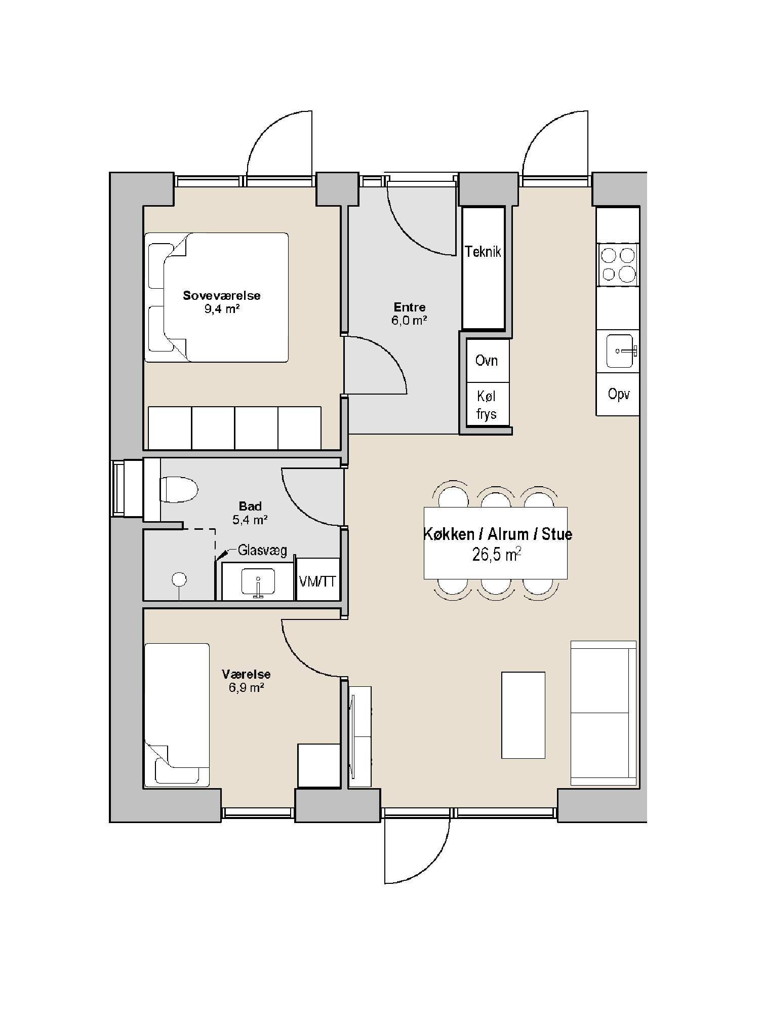 Boligerne opføres med holdbare, tidløse materialer og gennemtænkte planløsninger, der skaber lyse og indbydende rum. De bliver bl.a. opført med alle hvidevarer installeret, Genvex anlæg og gulvvarme i hele huset. Der bliver loft til kip i alle rum og en stor terrasse udenfor, hvor der er plads til at nyde udelivet.